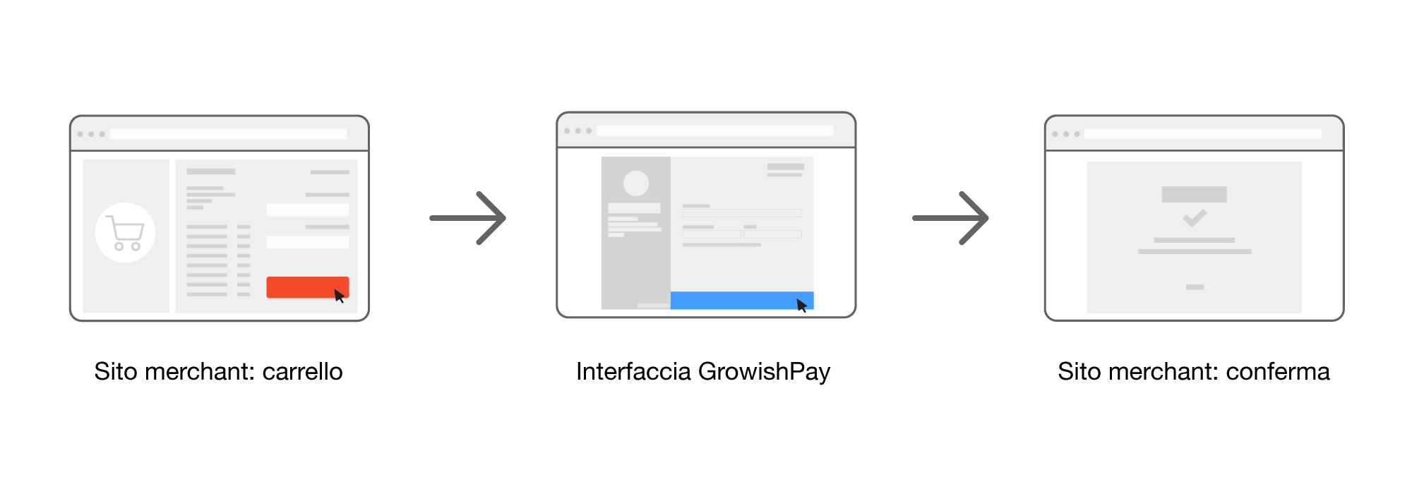 GWP è un Hosted Payment Gateway, come Paypal, quindi il cliente viene reindirizzato dalla pagina di checkout dell'ecommerce, alla pagina del gateway di pagemento, ospitato sui server di Growish. Una volta completato il pagamento, il cliente viene rimandato sull'ecommerce, per completare l'ordine.